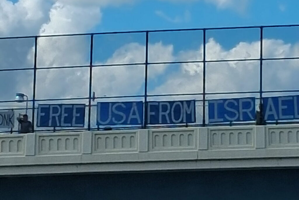The banners, according to an eyewitness, read “No Kings…Free USA From Israel”, along with people holding up signs saying “honk.”