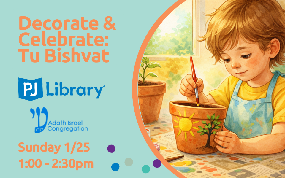 Celebrate the New Year for Trees with friends, PJ Library, and Adath Israel! We'll come together to read a special Tu Bishvat story, paint planting pots, and make a holiday themed snack. View event on Jlive: https://jlive.app/events/14273